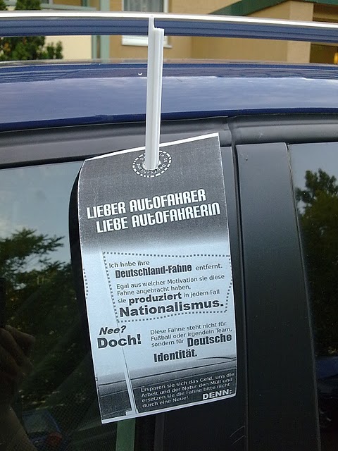 nationalismus entsteht eher durch deppen, die den unterschied zwischen 3. reich und bundesrepublik nicht kennen (wollen).da wünscht man sich mehr und mehr, man würde NICHT in einem land leben, in dem leute anderen so ihre hirnverbrannte meinung aufdrängen dürfen und dabei noch sachbeschädigung begehen