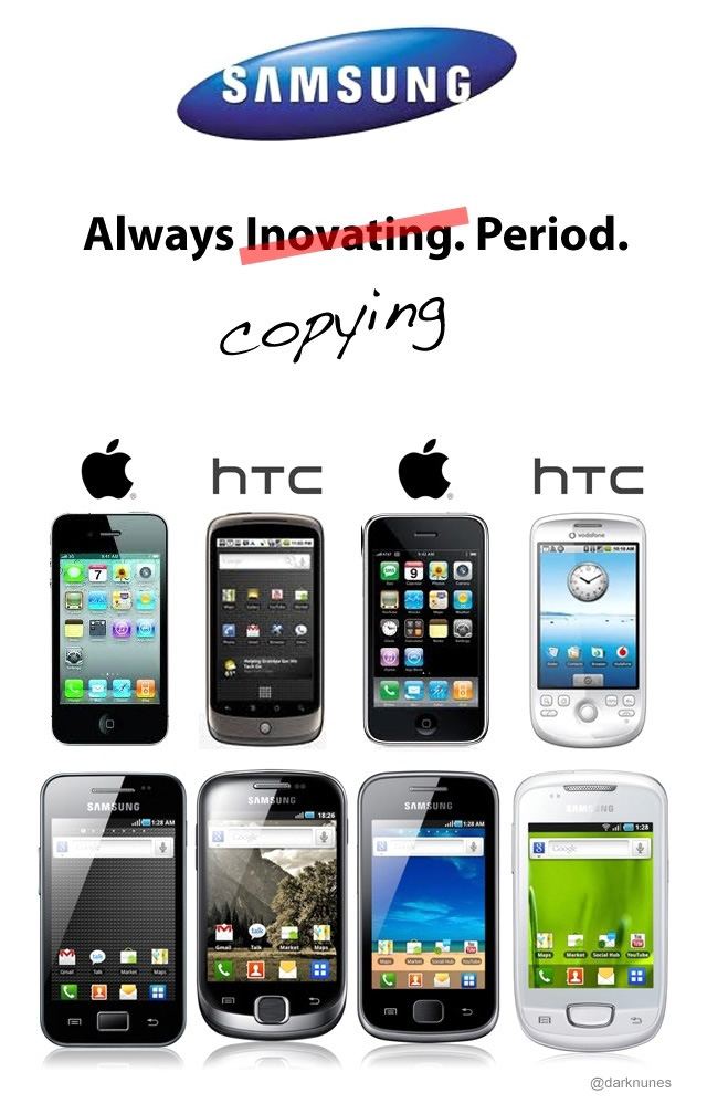 zu dem copysamsung bild. also wenn apple kopiert isses superinnovativ (smartphones gibts erst seit dem iphone ich weiß, und die erde seit 500 jahren), wenns andere machen superböse.