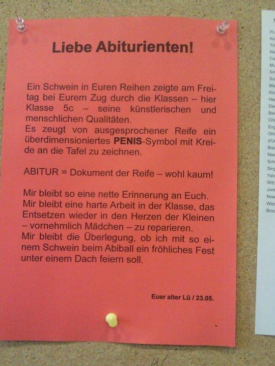 Hauptsache die Sache mit dem Hinweis an die Abiturienten, weil einer einen Pimmel an die Tafel gemalt hat war an meiner Penne!!!