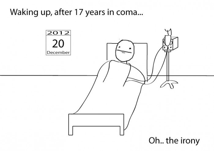 er erwacht nach 17 Jahren weider zum leben und am nächsten tag soll die welt (nach dem Maja-Kalender) untergehen. Ironie.