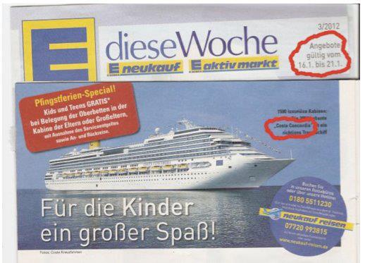 diese costa concordia scheiße regt mich so auf. die prospekte wurde schon am 13.01.2012 ausgeliefert und konnten wohl kaum noch aufgehalten werden. was soll daran lustig sein, dass die danach untergegangen ist? als ob edeka so blöd wäre. die ganzen klugscheißer dann noch, die auf facebook mit ihren 9malklugen kommentaren rumnerven. und dann darf man sich das hier gleich 2 mal geben, als obs dadurch lustiger würde…
