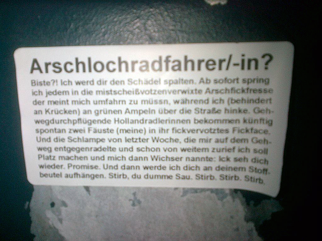 Ich halte dem Verfasser der Botschaft auf dem letzten Bild die Daumen, möge er/sie viele radfahrende Egoschweine erlegen!