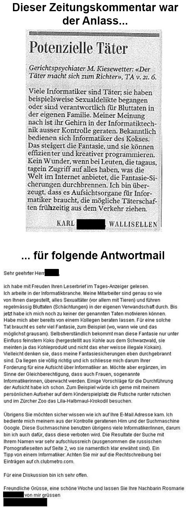 Also den Namen von dem Typen der die Informatiker runter macht, hätte man mehr schwärzen sollen, denn durch googlen findet man schnell heraus, dass er Karl Roth heißt und aus Wallisellen, schweiz, stammt