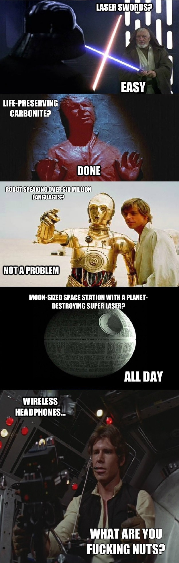 1. Kabelheadsets sind abhörsicher und billiger als quantentechnologie, dashlab macht es keinen sinn kabelose headsets im Milleniumfalken zu haben