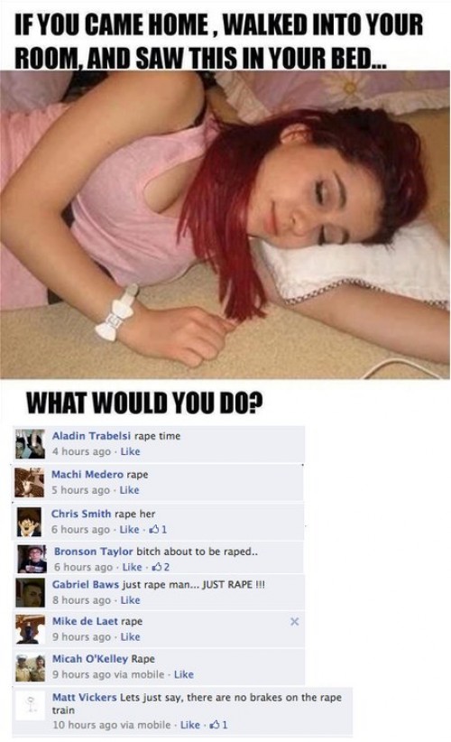 Was zur Hölle soll an dem verdammten „It’s rape time“ Bild lustig sein? Wenn ihr das lustig findet, kann ich euch nur bemitleiden.