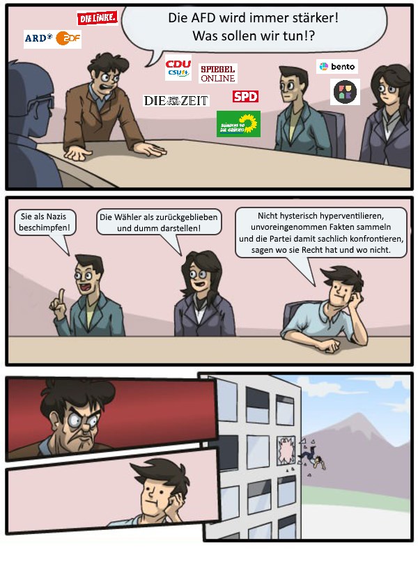 Ich bin politisch links, habe die AFD gewhält und bin absolut schockiert wie absurd die Reaktionen auf den Wahlerfolg der AFD sind. AFD =/= Nazis. 25% der Forderungen der AFD sind Banane, 75% sind absolut richtig und können nicht widerlegt werden, daher wird versucht sie lächerlich zu machen.