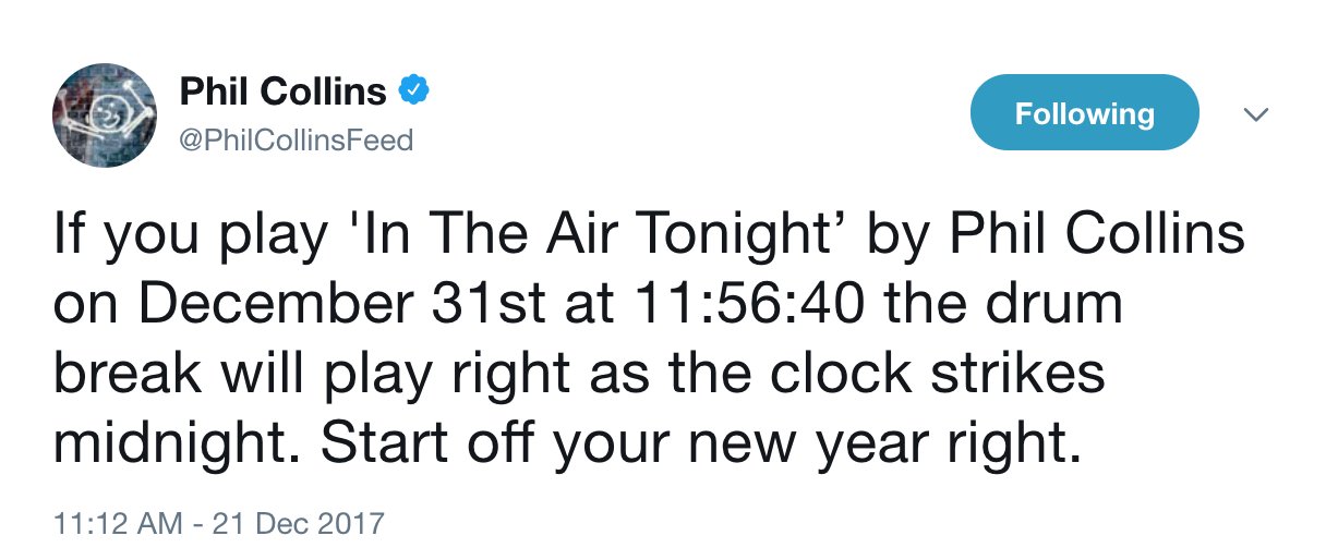 WICHTIGER HINWEIS für ALLE für HEUTE Abend: Man muss „In the Air tonight“ schon um 23:54:20* starten, nicht 40! Sonst wird’s ’n Scheiß Jahr.