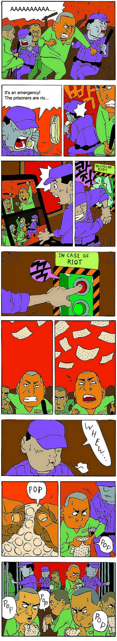 Cooler Dump, doch den Comic verstehe ich nicht so ganz… Warum fallen da plötzlich Kondome mit Noppen von der Decke und warum sind die Häftlinge dann plötzlich zu frieden und denken nur noch ans poppen? Wo ist da der Witz? Soll das eine Anspielung sein oder einfach nur sinnfrei? 😕
