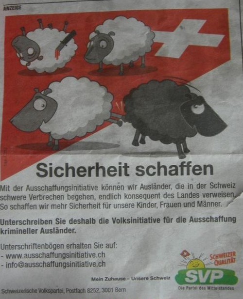 Nee das Bild mit den Schafen ist überhaupt net rassistisch. Wir haben genug Ausländer in der Schweiz die sich nicht an die Spielregeln halten und solche gehöre ausgeschafft mit samt der Familie. Greets aus der Schweiz