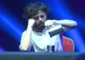 man sieht genau dass er sich unter dem tisch einen runterholt und er nur mit tomaten spielt um das publikum abzulenken!
